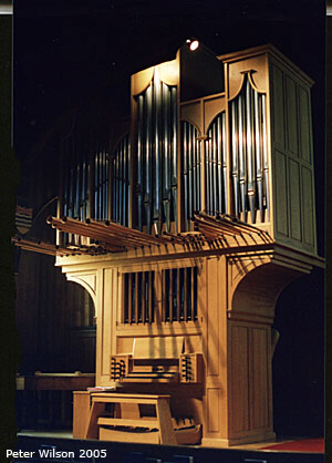 16 Bourdon 8 Open Diapason 8 Proncipal 8 Harmonic Flute 8 Chimney Flute 4 Octave 4 Prestant 4 Spitz Flute 22⁄3 Twelfth 2 Superoctave 2 Wald Flute 11⁄3 Larigot IV Mixture III Cymbel V Cornet 16 Double Trumpet 8 Trumpet Récit/Swell